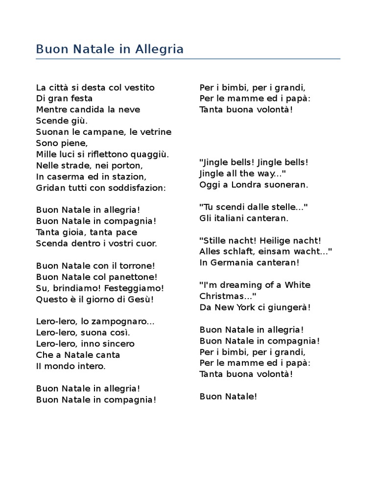 Lyrics to Buon Natale In Allegria by Piccolo Coro Mariele Ventre DellAntoniano. Lero-lero inno sincero Che a Natale canta il mondo intero. Leggi il testo buon natale in allegria di sounds good tratto dallalbum sing my song xmas.